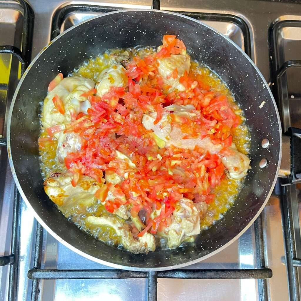 Step 2: Now it’s time to add the chopped tomatoes. Add the tomatoes and sprinkle in salt and turmeric powder. The remaining spices will be mixed into the yogurt later to create a paste for the cooking process. Cook for 2-3 minutes, then cover the pan with a lid and let it cook for another 7-9 minutes until the tomatoes are soft and the chicken is about 70% cooked. Afterward, remove the lid.
