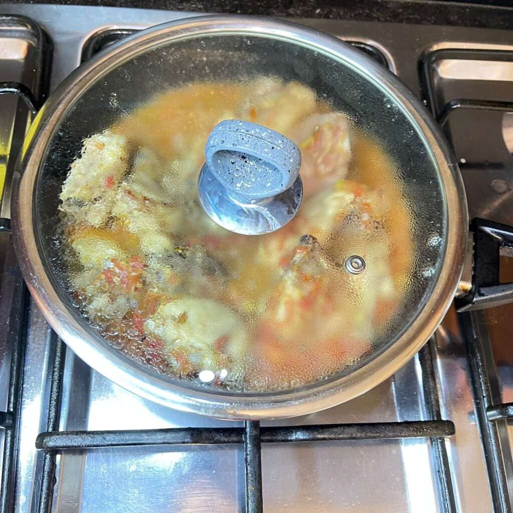 - After roasting the tomatoes, add 1 cup of water and cover the lid. Let this simmer for 20-25 minutes on the stovetop. If you prefer quicker cooking, you can use a pressure cooker. In that case, add 1/2 cup of water and pressure cook for about 10 minutes, as mutton takes longer to get tender.
