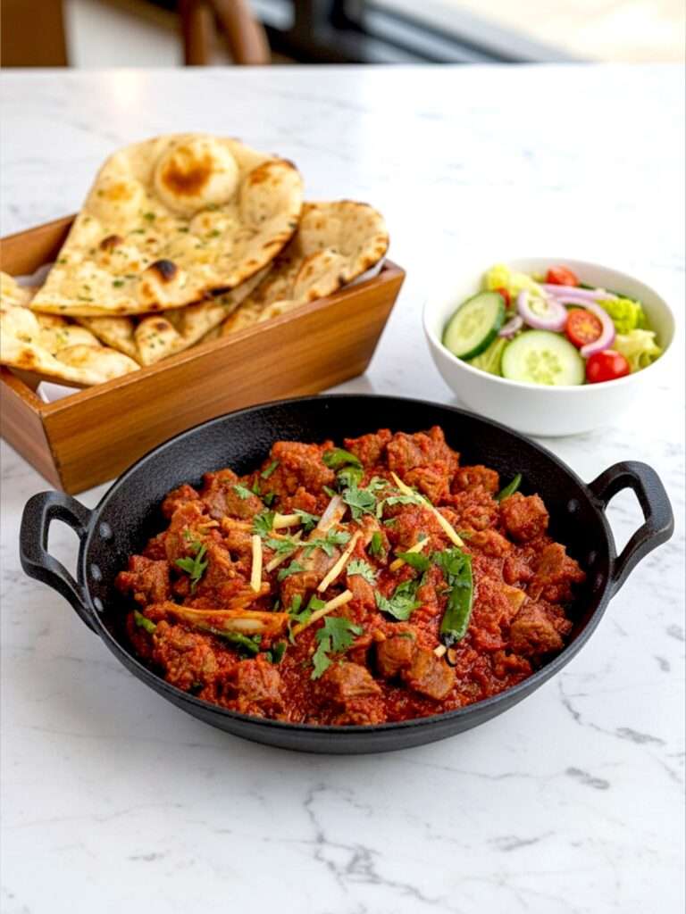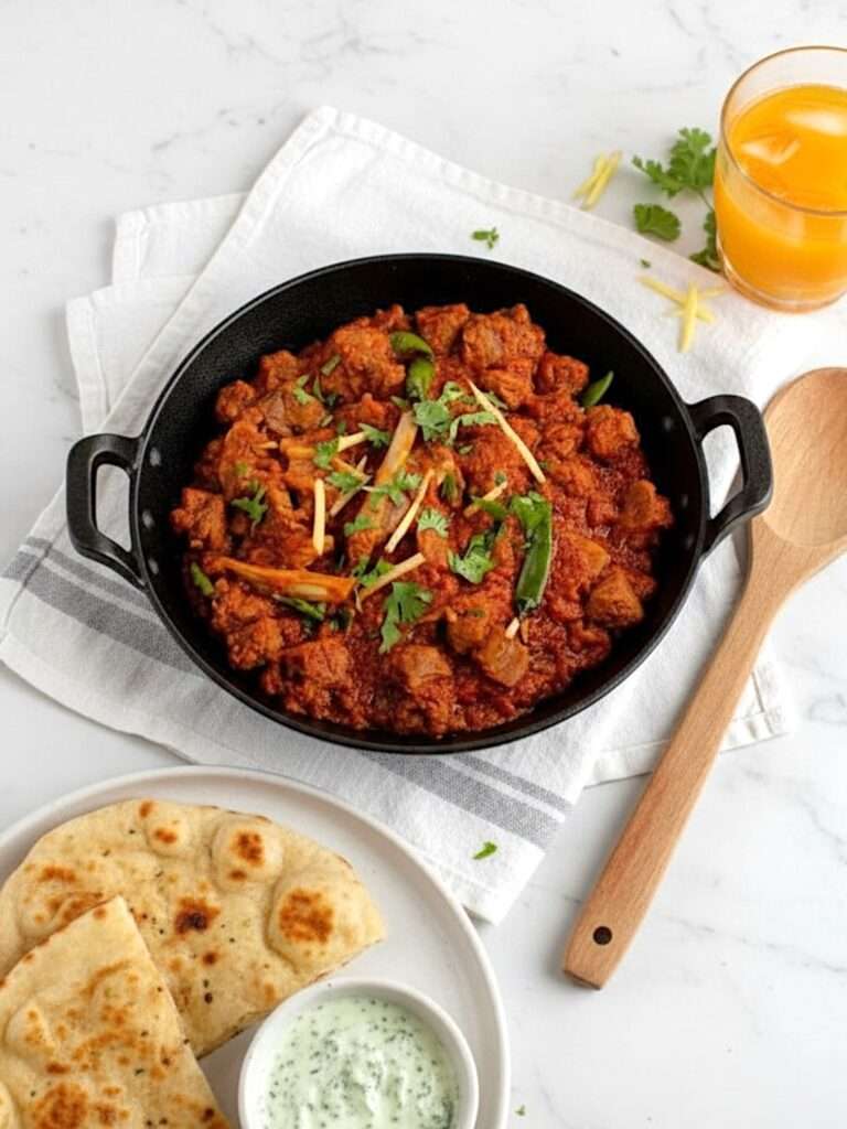 For a bit of variety, you can also add a tomato chutney (a Punjabi favorite!). But honestly, I’d say keep it simple, naan, raita, and salad are all you really need to let the karahi shine!