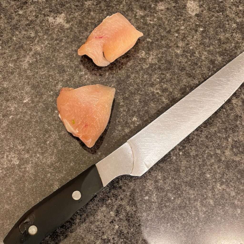 - Start by cutting boneless chicken thighs or breasts into uniform 2-inch cubes ensuring they are well cleaned.