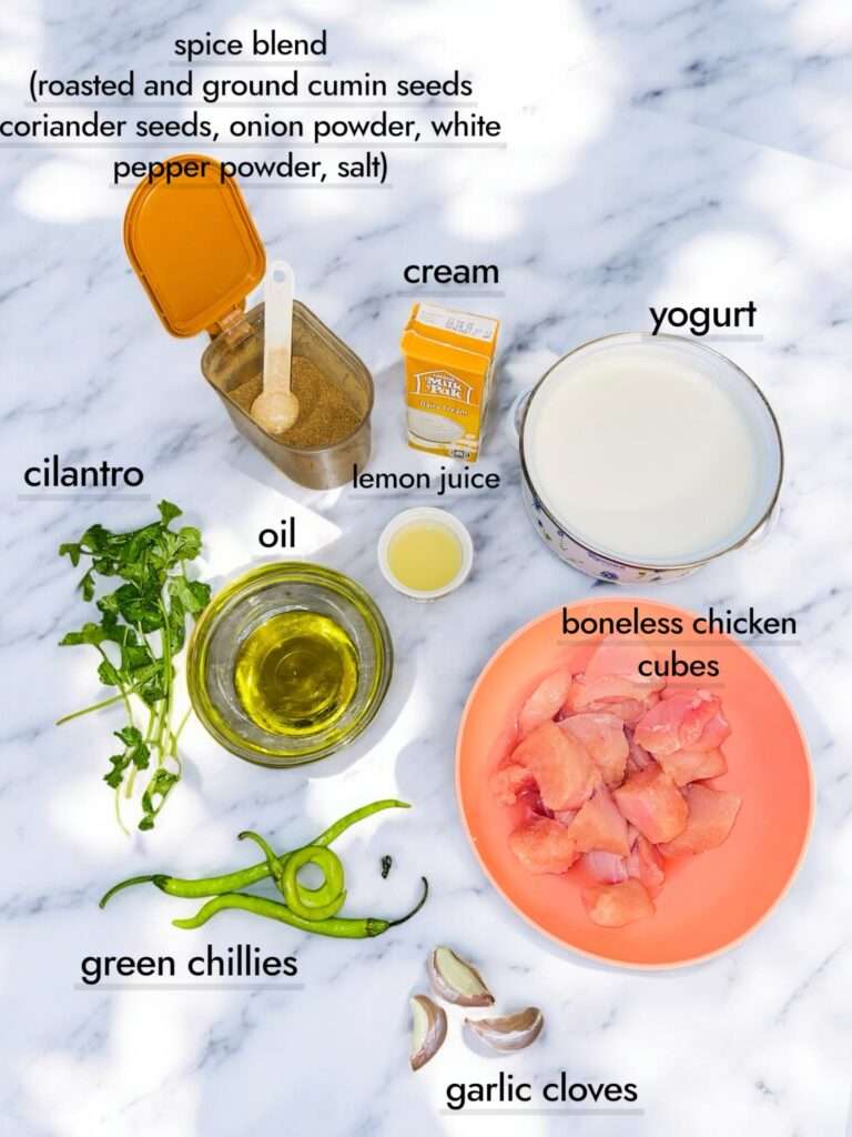 This dish is called Chicken Malai Tikka, also known as Malai Boti or Tikka Malai Boti. In Urdu ‘malai’ means cream which refers to the creamy texture of the dish. Usually it’s made with chicken but you can also try it with beef or mutton.