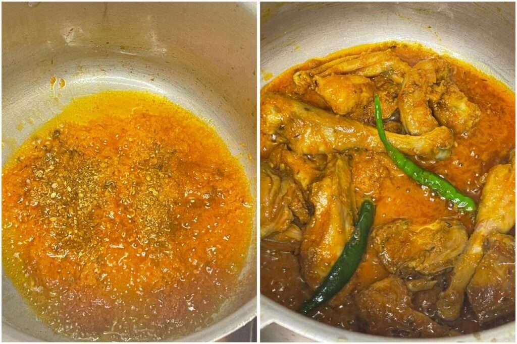 2. Reheat the leftover oil, add the blended paste, and cook for 3-5 minutes. Add all spices except kasuri methi and garam masala, and cook until bubbles begin to appear. Add the chicken and fry it for 10-12 minutes, as the longer you fry, the better it tastes. Stir often to stop it from sticking. Add green chilies for aroma.