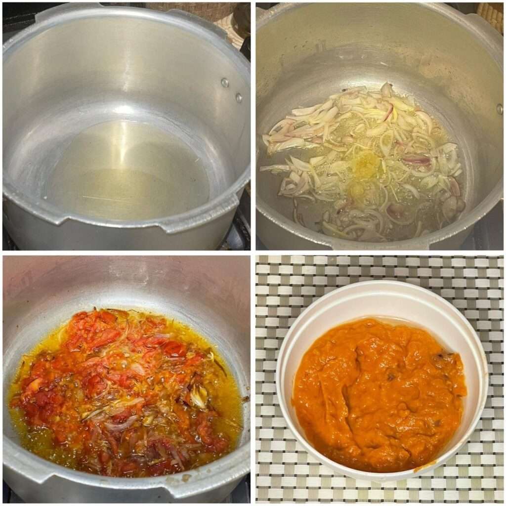 1. Heat oil in the pan, fry chopped onions until golden, then add ginger-garlic paste and cook until its raw smell disappears. Add tomatoes and cook until soft, water dries, and oil separates. Blend this onion-tomato mixture into a smooth paste with hot water and set aside.